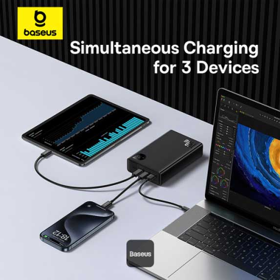 - شارژ همزمان 3 دستگاه: شامل دو پورت Type-C (یکی با توان 140 وات) و یک پورت USB-A برای انعطافپذیری بیشتر .