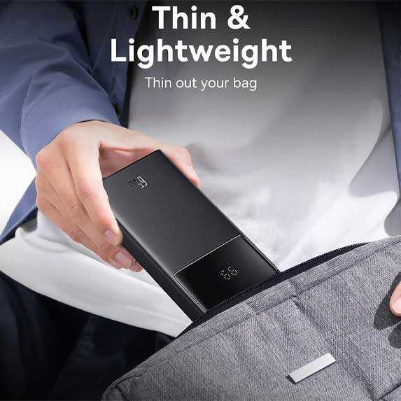 با ابعاد 150.3 در 69.0 در 27.9 میلیمتر و وزن مناسب، این پاوربانک به راحتی در کیف یا کولهپشتی جای میگیرد. طراحی بدنه هم کاربردی است و هم از دستگاه در برابر ضربات جزئی محافظت میکند.