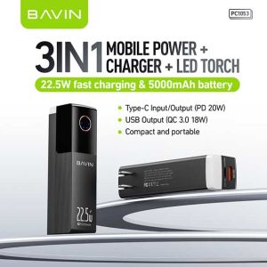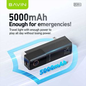 شارژر دیواری و پاوربانک چندکاره Bavin PC1053 با توان 22.5 وات، یک راهحل همهجانبه و قابل حمل برای تأمین انرژی دستگاههای شما ارائه میدهد. این محصول ترکیبی هوشمندانه از یک پاوربانک 5000 میلیآمپرساعتی و یک شارژر دیواری سریع است.