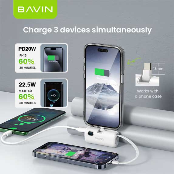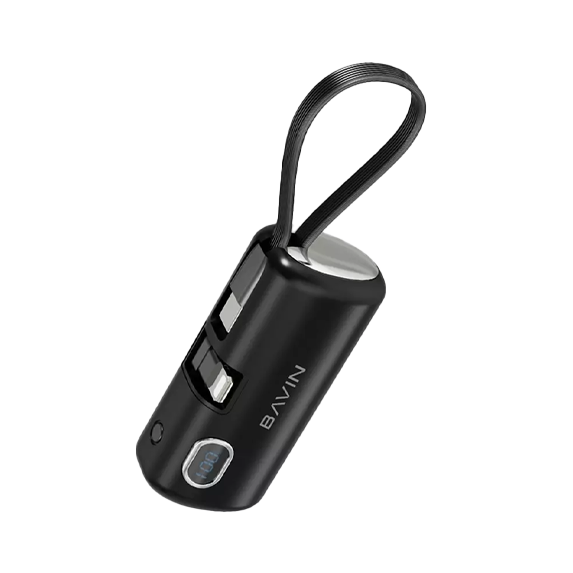 یکی از ویژگیهای برجسته پاوربانک Bavin PC109s ، طراحی بسیار کوچک و سبک آن است که علاوه بر کابل تایپ سی، یک پورت لایتنینگ تاشو نیز برای آن در نظر گرفته شده است. ابعاد این پاوربانک بسیار جمع و جور است که حمل آن را بسیار آسان کرده و به راحتی در جیب یا کیف جای میگیرد.